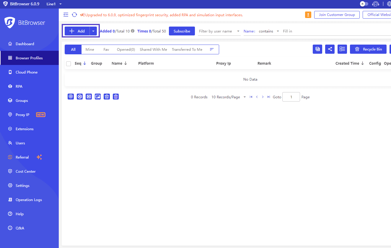 Navigate to the "Browser Profiles" section, then select the "+ Add" button to create a new profile.