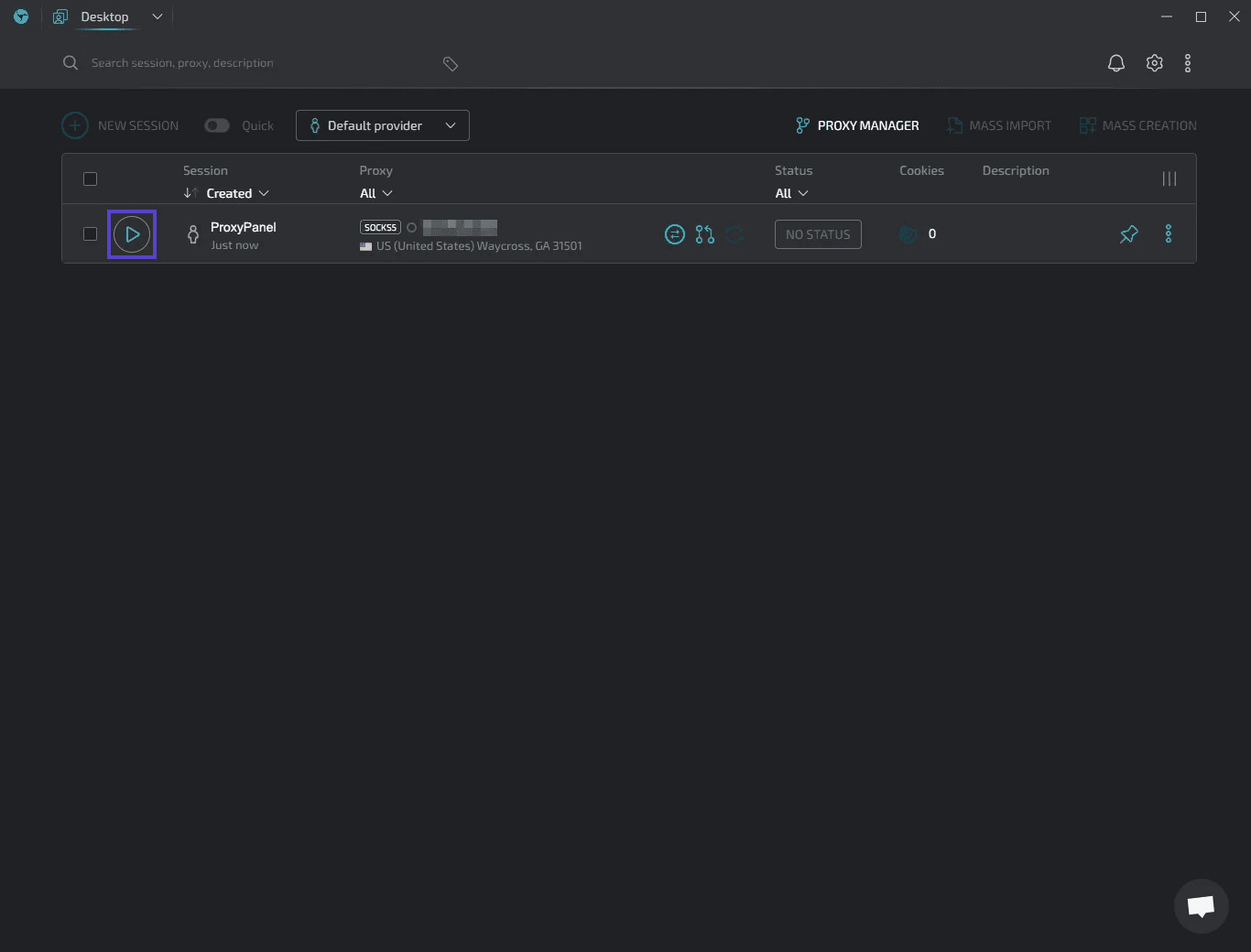 Assign a name to your session and indicate the protocol you prefer for your proxy.For easy setup, you can simply copy and paste your proxy details in the "host:port@username:password" format, available in your ProxyPanel dashboard. Once configured, verify the functionality of your proxy, then click "Save" to confirm the settings.